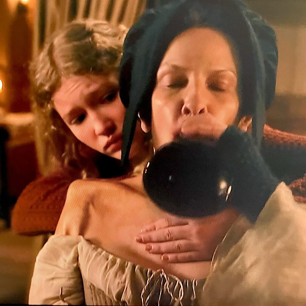 Please note the candle flame in front of Claire’s microscope (above image). This provides light to the mirror. However, because there is a huge window to Frances’ left, I would skip the flame and turn the mirror to collect more visible light from the outside window! 🪟
